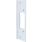 A strengthend door frame is just as important as the door. Replacing the small latchplate with a larger one and using 4 inch screws helps secure the door frame from force and splitting. |